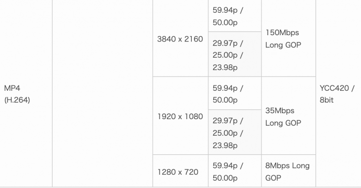 - 3840 x 2160: 59.94p/50.00p/29.97p/25.00p/23.98p