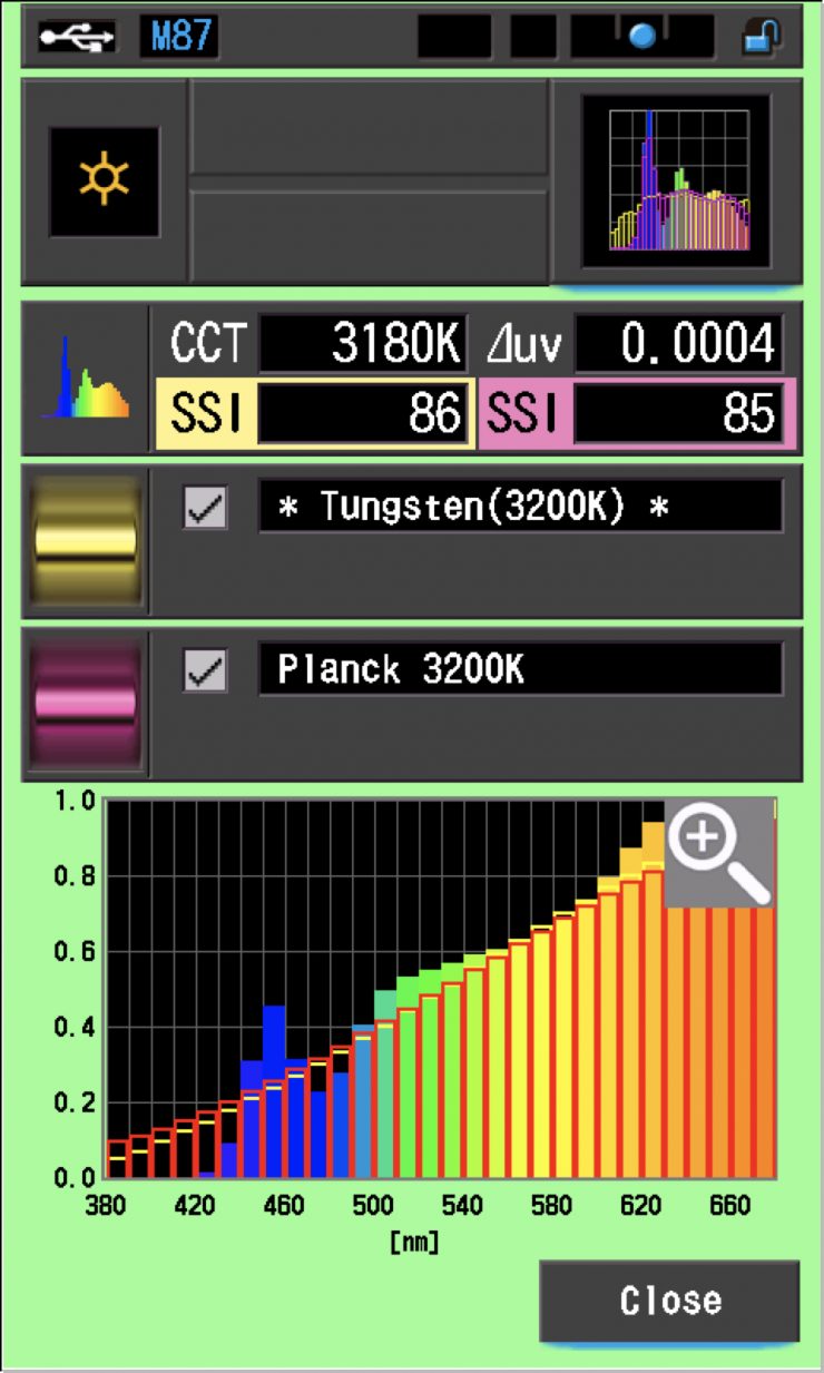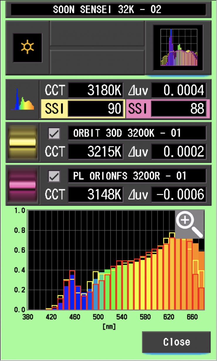SSI (Spectral Similarity Index) was developed by the Sci-Tech Council of the Academy. SSI gives me the ability to set any light as a standard, or use predefined standards (such as CIE D55), and then give other lights an SSI score based upon how well they will match standards such as CIE D55 measure spectral response and compare it directly against an ideal light source.