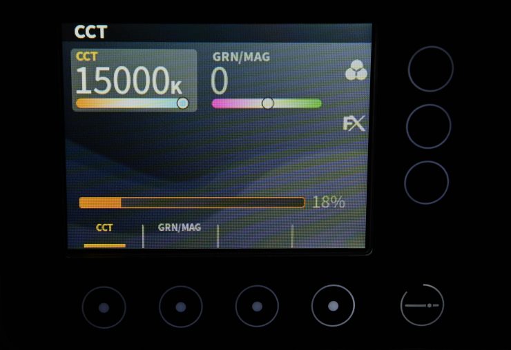 The fixture features calibrated red, green, blue, and white LEDs (RGBW) which allows it to produce white light in any CCT from 2200K to 15000K. It also has green/magenta adjustment and it is claimed to produce vivid, saturated colors.