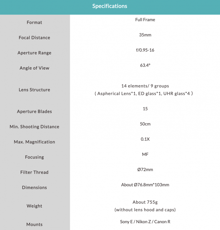 The lens is available in Sony E, Nikon Z and Canon R mounts. The lens weighs around 755g / 1.66 lb and it features a de-clicked aperture that can also be switched back into a clicked mode.