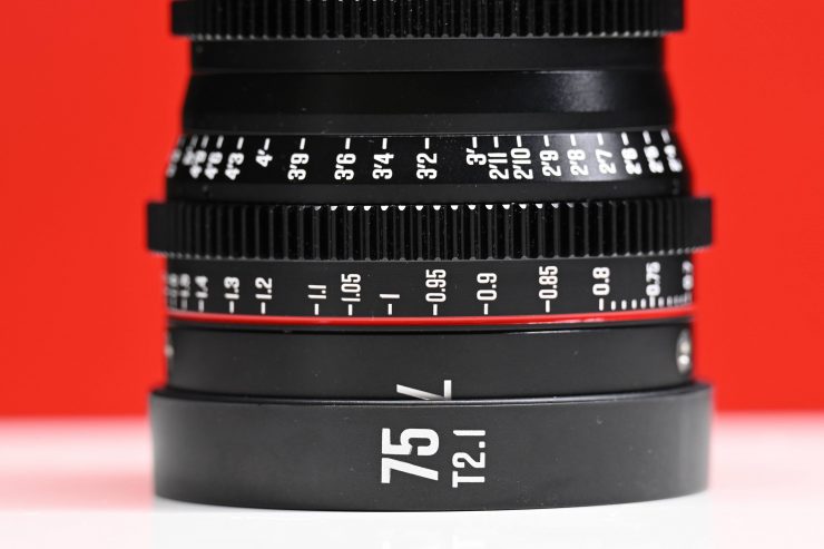 The minimum focusing distance of the 75mm T2.1 is 70cm / 2.29′ and it has a front filter diameter of 77mm. The lens has a focus throw of 270 Degrees and both the iris and focus ring feature industry-standard 0.8 pitch gears. It is possible to manually pull focus from infinity to the minimum focusing distance in one go, despite the large 270 degrees of rotation. This is mainly because the physical size of the lens barrel isn’t that big.