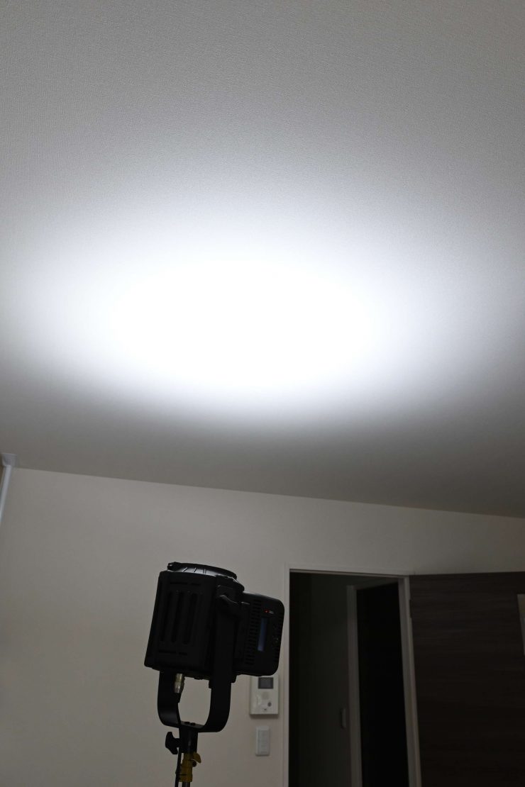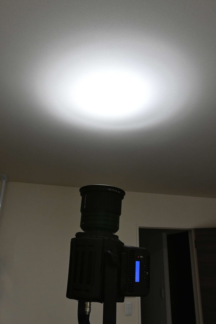 Above you can see what it looks like if it is punched directly into the ceiling using the reflector, open face, and with the Prolycht 2x Fresnel.