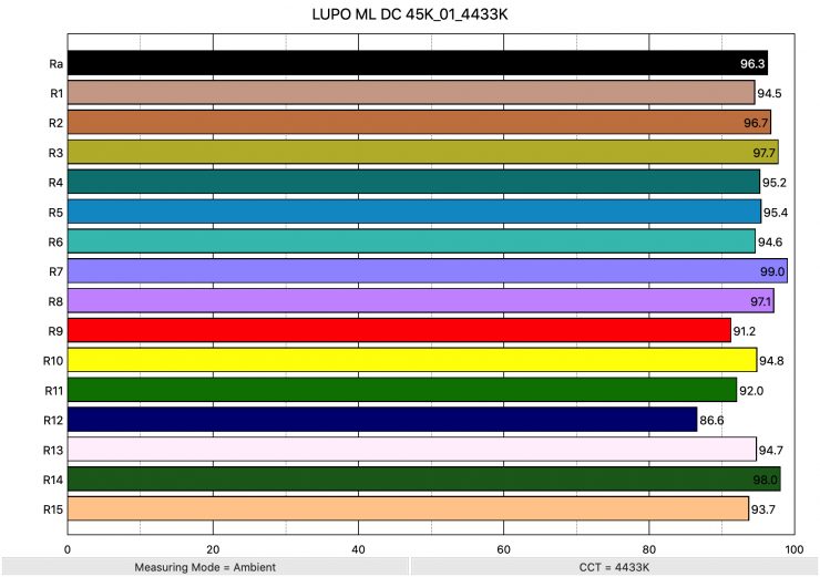 So now that we have seen how much output the Movielight 300 Dual Color PRO produces, how does it perform when it comes to replicating accurate colors? Above you can see that the light recorded an average CRI (R1-R8) of 96.8 and an extended CRI (R1-R15) of 96.06. For replicating accurate skin tones it recorded 97.9 R9 (red), 98.5 for R13 (closest to caucasian skin tones), and 98.2 for R15 (closest to Asian skin tones). These are excellent results. Only R12 was below 90.