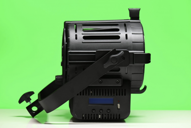On the side of the light, you will find a small LCD display and three buttons. These buttons allow you to increase/decrease the intensity and Kelvin color temperature as well as access a basic menu.