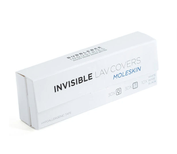 Each package of Invisible Lav Covers – Moleskin consists of 10 black, 10 white, and 10 beige pieces, and 30 pieces of our super sticky, hypoallergenic Invisible Lav Tape. Each pack of moleskin is good for a minimum of 30 mounts.