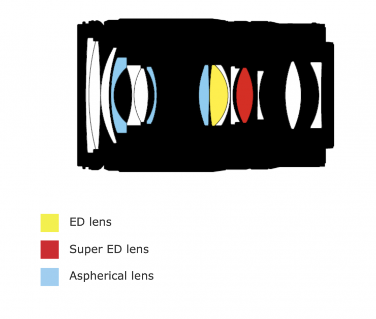 The optical design of the lens consists of 15 elements in 12 groups (1 super ED lens, 1 ED lens, 3 aspherical lenses) and it has 9 aperture blades.