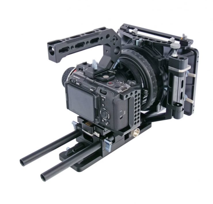 The FX3-04 kit comes with just about everything you need. In addition to the basic camera cage you get a top handle, 15mm baseplate, 15mm rods, a dovetail plate, a follow focus that attaches to 15mm rods, focus gear rings, and a swing-away matte box that accepts 4 x 4 filters.