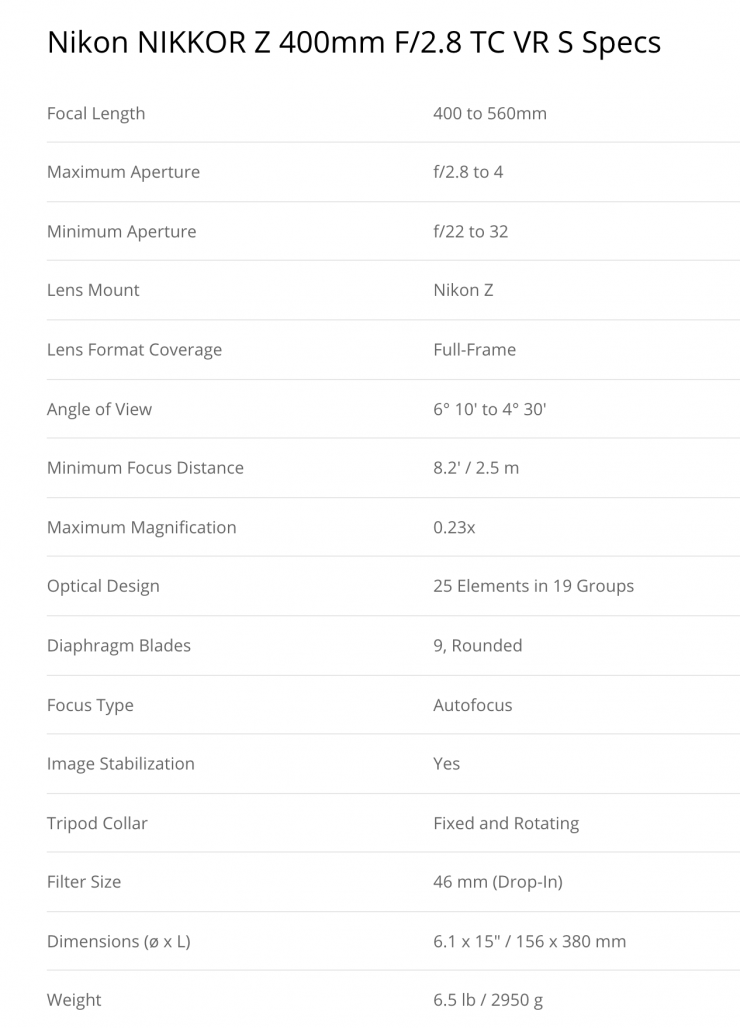 The Nikon NIKKOR Z 400mm f/2.8 TC VR S Lens is now available to pre-order for $13,996.95 USD. It will be released on February 18th, 2022.