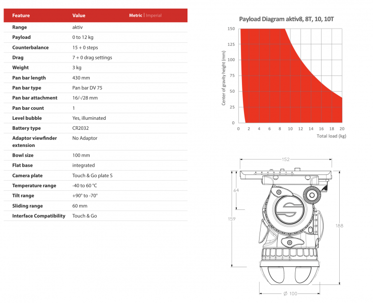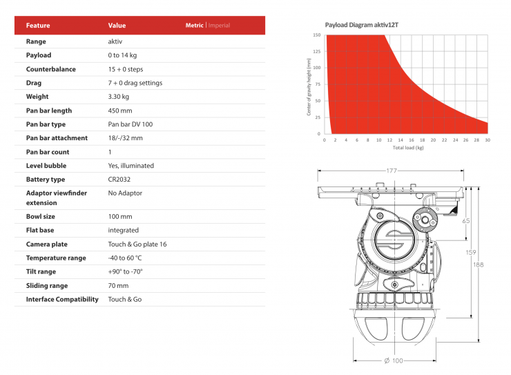 All aktiv heads support payloads starting from 0kg, and the three new models support up to 12kg for the aktiv10T, 14kg for the aktiv12T and 16kg for the aktiv14T and all feature 15 steps of counterbalance and 7 steps of drag. The new heads are suitable for use with heavier payloads in electronic newsgathering, cinematography, and documentary productions.