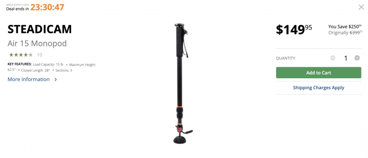 The STEADICAM Air 15 Monopod is on sale for $149.95 USD, which is a saving of $250 USD. I own a STEADICAM Air 25 and I really like it. I use it occasionally with larger-sized digital cinema cameras.
