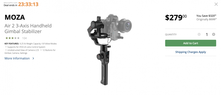 I just wanted to flag a couple of items listed in B&H’s daily deals that might be of interest to some of our readers. You can get the Moza Air 2 3-Axis Handheld Gimbal Stabilizer for $279 USD which is a saving of 53%. It usually retails for $599 USD.