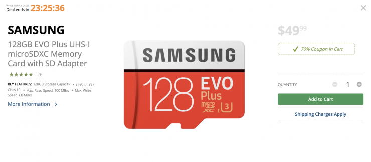 B&H also has the Samsung 128GB EVO Plus UHS-I microSDXC Memory Card with SD Adapter on sale for just $14.99 USD, which is a saving of 70% off the usual price of $49.99 USD. I have a few of these cards and I use them for action cameras, drones, and audio recording devices.