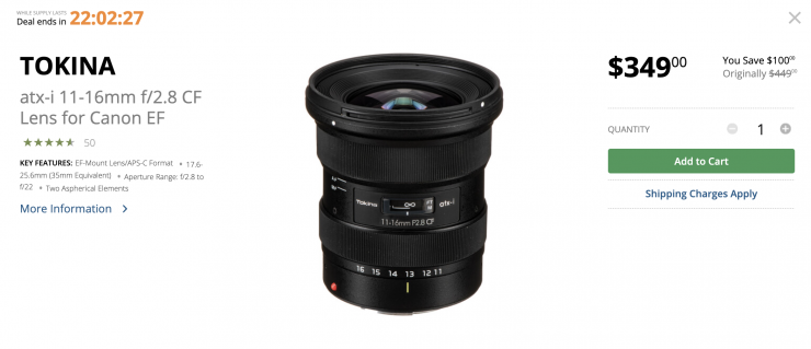 The Tokina atx-i 11-16mm f/2.8 CF Lens for Canon EF is on sale for $349 USD which is a saving of $100 USD.