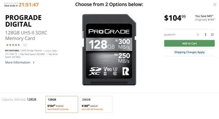The ProGrade Digital 128GB & 256GB UHS-II SDXC Memory Cards are on sale for $104.99 & $188.99 USD respectively.