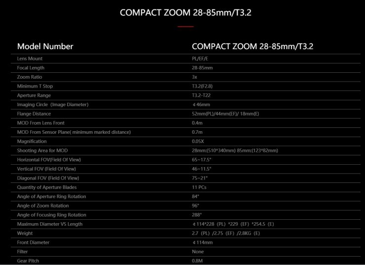 The CHIOPT Compact Zoom 28-85mm T3.2 will retail for $2899 USD which makes it incredibly good value for money. It will be officially announced on the 15th of February.