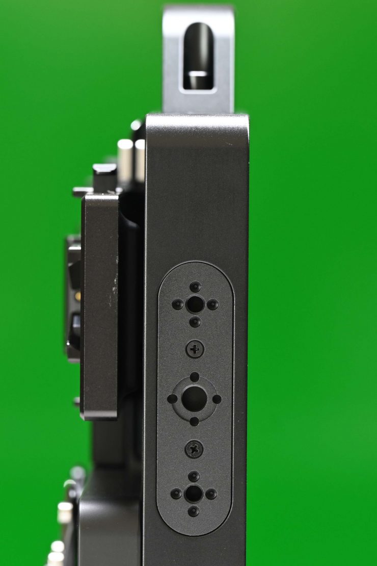 The Cine 13 features a dovetail mounting rail for battery plate or accessory mounting, and a removable bottom Cheese Rail for additional mounting flexibility.
