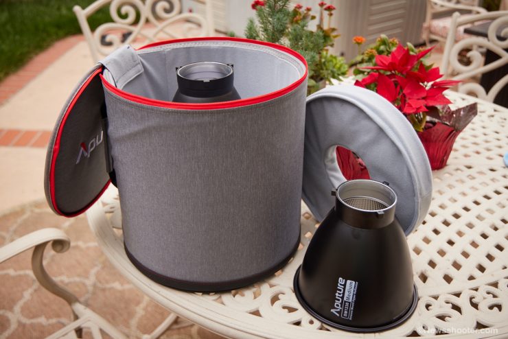 If you are familiar with COB reflectors, you can see Aputure has changed to a more intense beam design lately. The shiny raised pattern interior is the key to adding more output and shaping the light with the three different reflectors’ sizes and lengths.