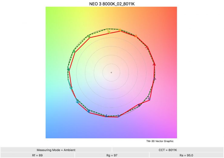 In the graph above the gold bars indicate a perfect CIE D55 source. The red bars indicate a perfect CIE D 5600K source. A score in the low to mid 70’s is good for a 5600K LED source. The NEO 3 scored 70.