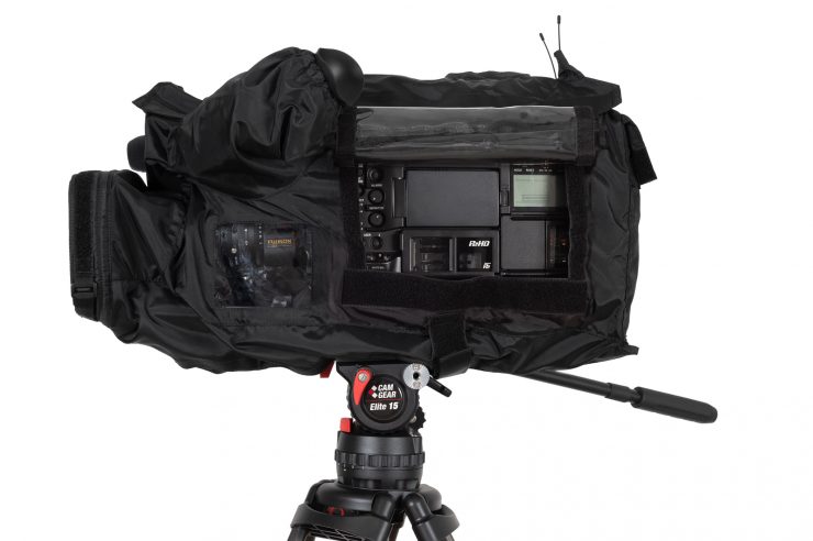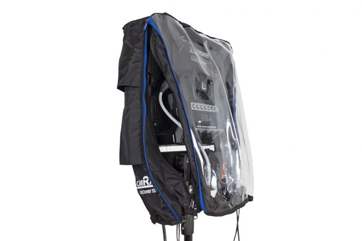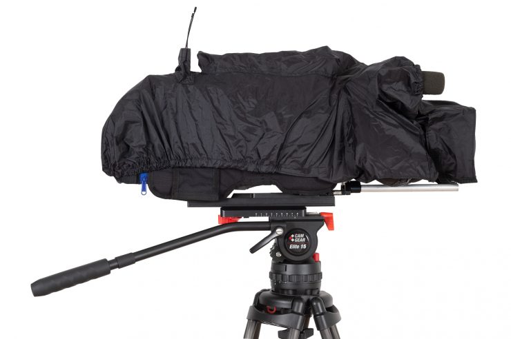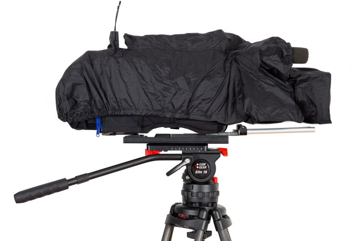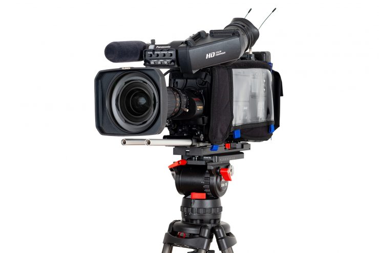 The first is the rainCover ENG/EFP. It is a universal cover for a wide range of Sony, Panasonic, Blackmagic URSA, Grass Valley, Hitachi, Ikegami, and JVC broadcast cameras. This rain protection cover is suitable for shoulder camera work but is also great while the camera is attached to a VCT- plate, tripod, pedestal, or any other camera support solution.