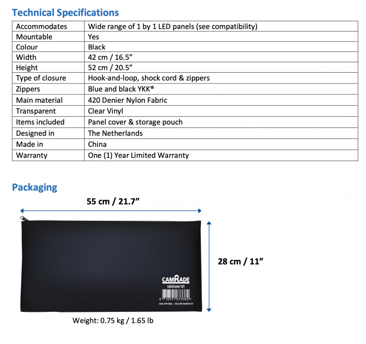 The second is the rainCover 1X1. It is a universal rain cover that ensures that your light source is protected when shooting in adverse conditions such as rain or snow. According to camRade, the durability and unique features of the rainCover 1X1 will protect your investment in a way that plastic bags and other cheap covers cannot.