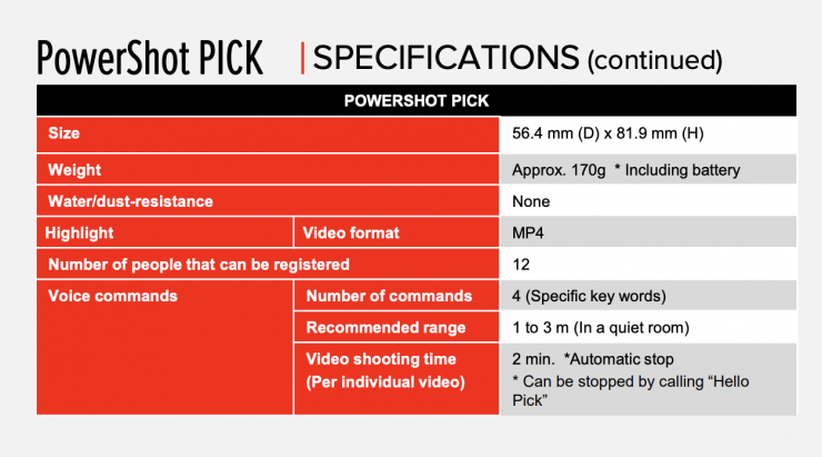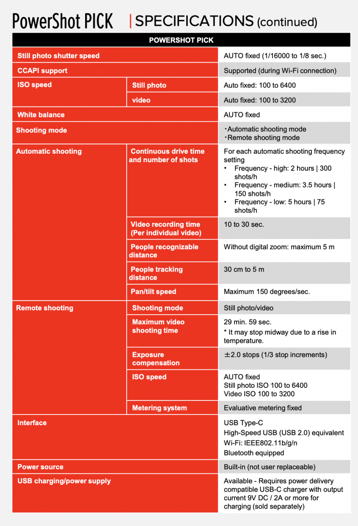 The PowerShot PICK utilizes a 19-57mm focal length range and it offers a broad field of view of 340˚ horizontally and 110˚ vertically. It features USB-C charging and built-in Wi-Fi, which links to smart devices.