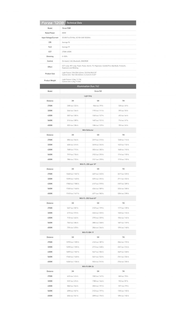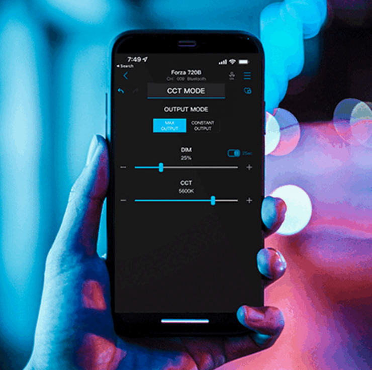 The lights can be controlled onboard or via Bluetooth/2.4G or DMX/RDM functionality. The Forza 720/720B both feature continuous dimming from 0-100% in 0.1