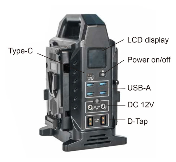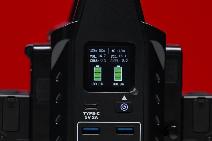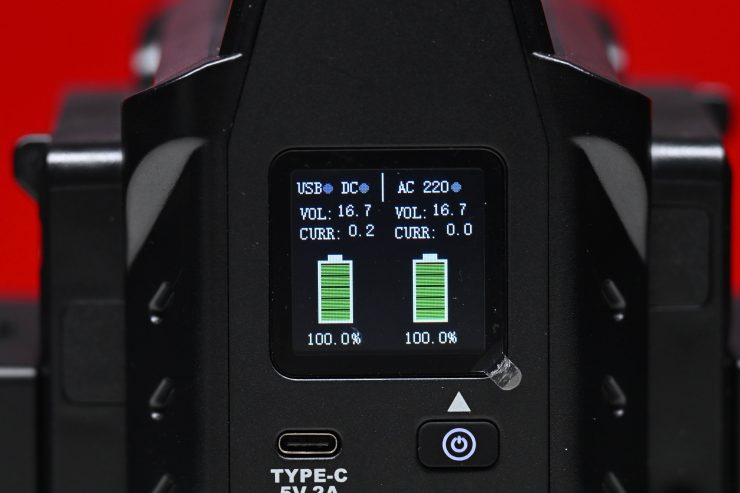 The attached batteries will begin charging automatically and the screen will display the charging status. If you are charging two batteries, the battery on the left-hand side will be charged first, and the battery on the right will start charging once the battery on the left is fully charged. You can charge most v-lock batteries using this device.
