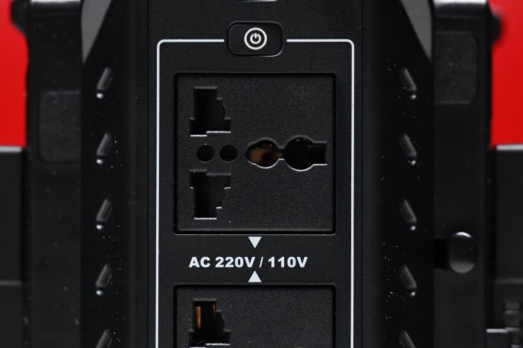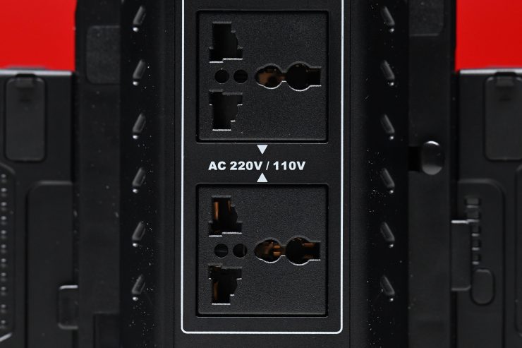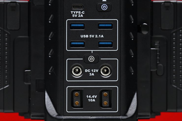 There are also two AC sockets that can take any AC power connector type in the world. This means you can use it to not only charge batteries but also to power lights, wireless video transmitters, monitors, etc. This is very handy if, for instance, you have lights that can’t be run via a battery, but can be run via mains power. You can simply use V-lock batteries to power the light remotely.