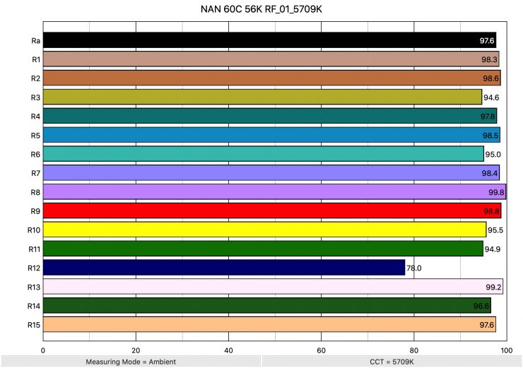 In the graph above the gold bars indicate a perfect CIE D55 source. The red bars indicate a perfect CIE D 5600K source. This lets us compare how close to a perfect 5600K lighting source the Forza 60C is. A score in the low 70’s is typical for a 5600K LED source.