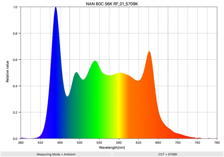 Above you can see the spectral distribution of the Forza 60c when it is set at 5600K. The spectral distribution isn’t overly full, and there are quite a few spikes.
