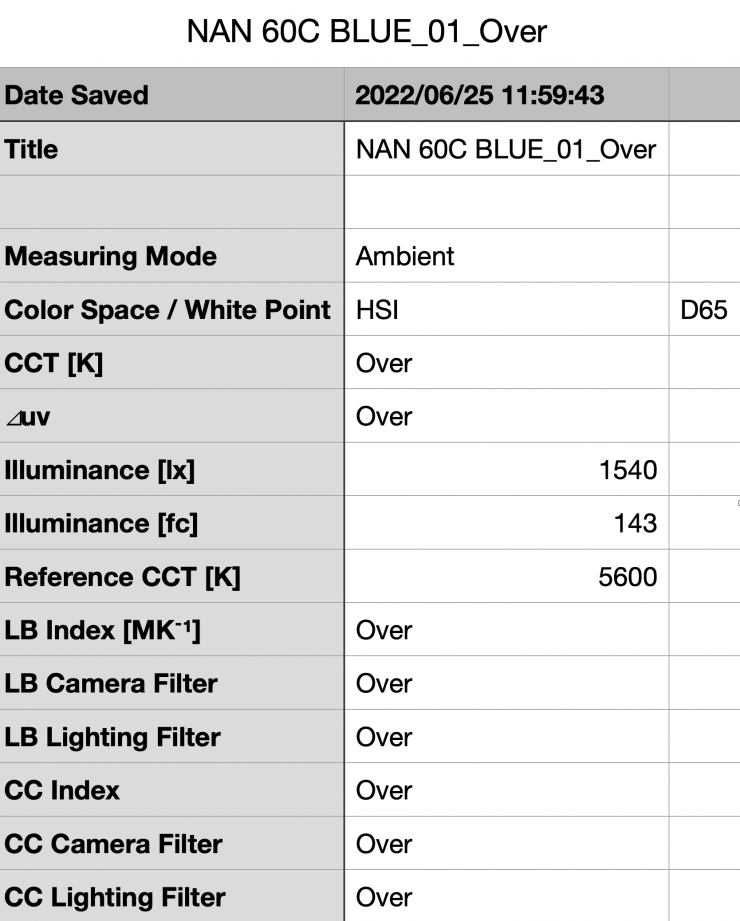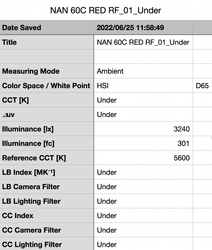 SSI (Spectral Similarity Index) was developed by the Sci-Tech Council of the Academy. SSI gives me the ability to set any light as a standard, or use predefined standards (such as CIE D55), and then give other lights an SSI score based upon how well they will match standards such as CIE D55. This way I can measure spectral response and compare it directly against an ideal light source. This is actually a much better test than recording CRI scores.