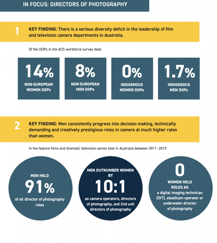 Findings from industry-reported production data reveal the shocking disparity between men and women performing the role of Directors of Photography (DOPs) on feature film and TV drama shot in Australia (between 2011 and 2019). The study found only 9% were women and 91% were men.
