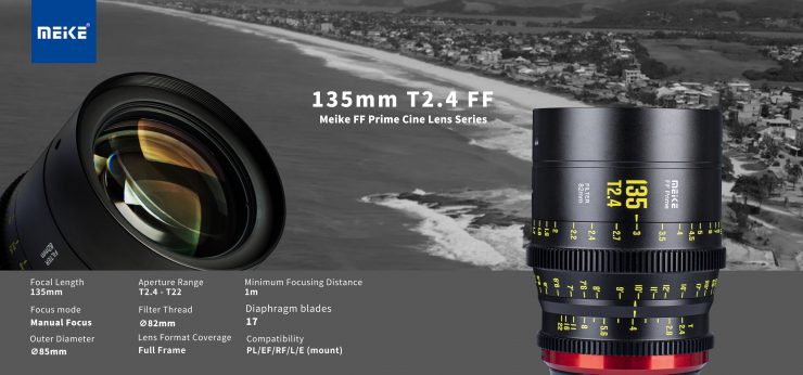 Meike has announced its new 135mm T2.4 FF cine lens. This is Meike’s sixth full-frame cine lens. It covers an image circle of 45mm and it is available in either PL, Canon EF, Canon RF, Sony E, or Panasonic L mounts.