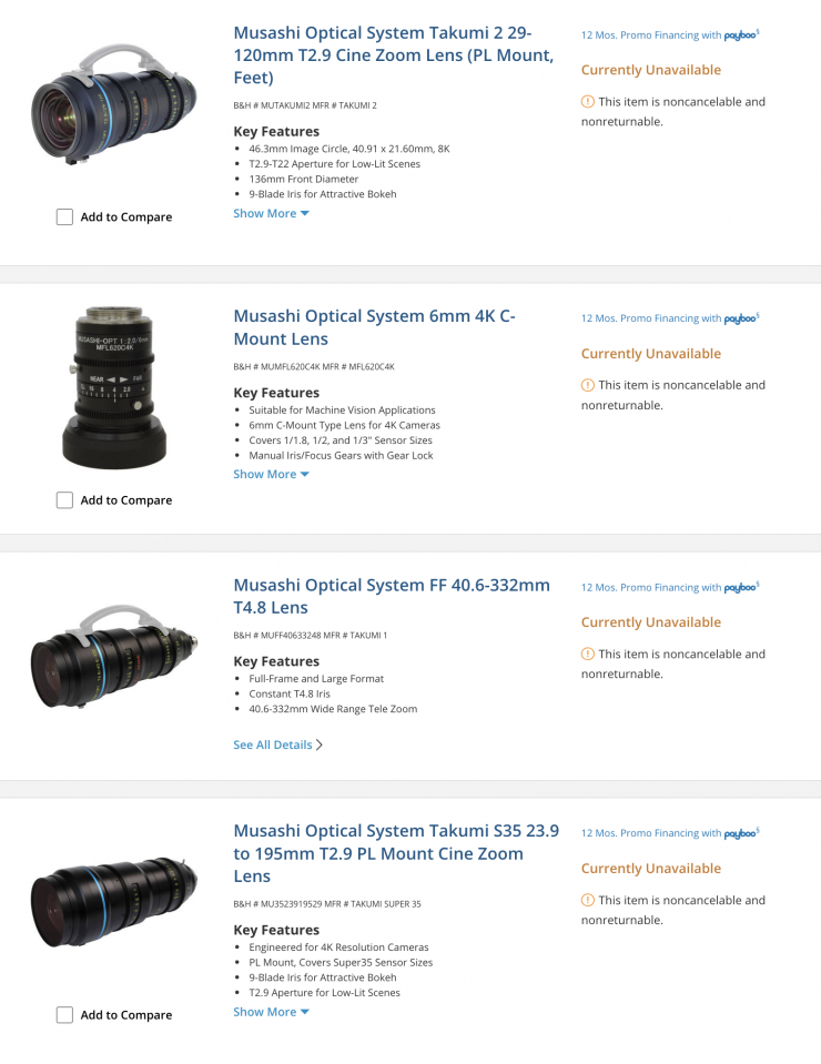 B&H now has all of the Musashi Optical lenses listed as Currently Unavailable.