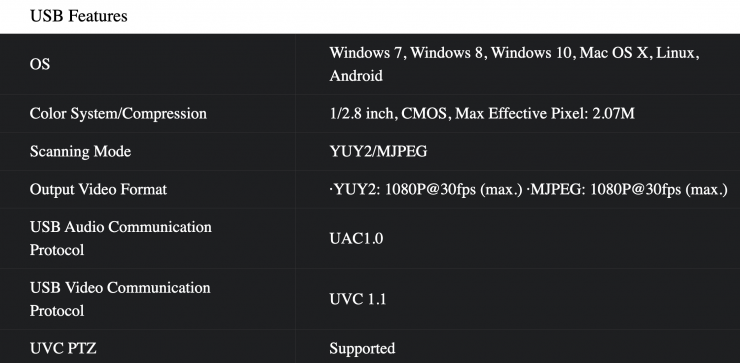 The camera’s USB output makes it plug-and-play for a more convenient and simple user experience. It is compatible with USB 3.0 and USB 2.0, and the camera supports video and encoding image output as well as UVC V1.1 and UAC 1.0 protocols. The interface is compatible with Windows 7/8/10, MacOS X, Linux, and Android operating systems.