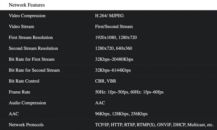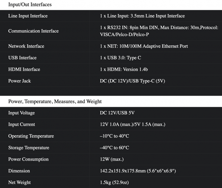 The camera features a 1/2.8″ CMOS sensor with 2.07MP effective pixels and it can stream video at up to 1080p 60 fps. The sensor has ultra-high 55 dB SNR that is claimed to effectively reduce image noise in low illumination. 2D and 3D noise reduction reduce noise, even in low-light conditions. Optically, the camera features a 72.5° wide angle lens with 12x optical zoom. A 3.5mm audio input allows for microphone or line-level integration.