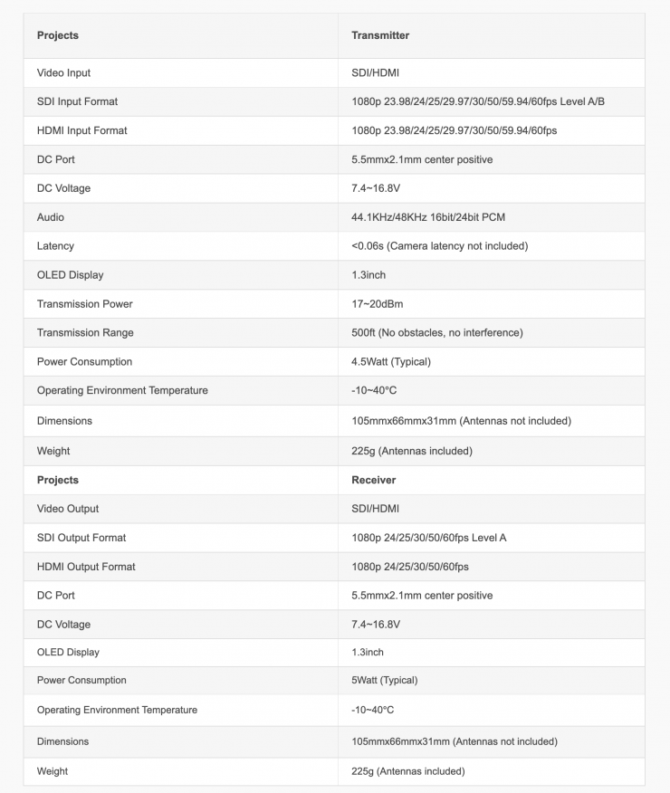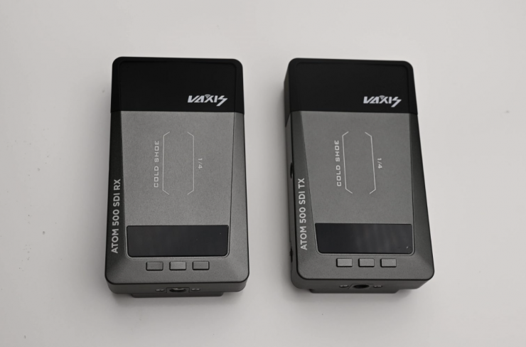 Vaxis sells the ATOM 500 SDI. The transmitter features one 3G-SDI and one HDMI input while the receiver has one 3G-SDI and one HDMI output. The ATOM 500 SDI is claimed to be able to transmit visually lossless, H.265 video signals to the Vaxis receiver with less than 80 ms latency. The system has a range of up to 500′ (line-of-sight) and it can also multicast via Wi-Fi to up to three mobile devices for monitoring.