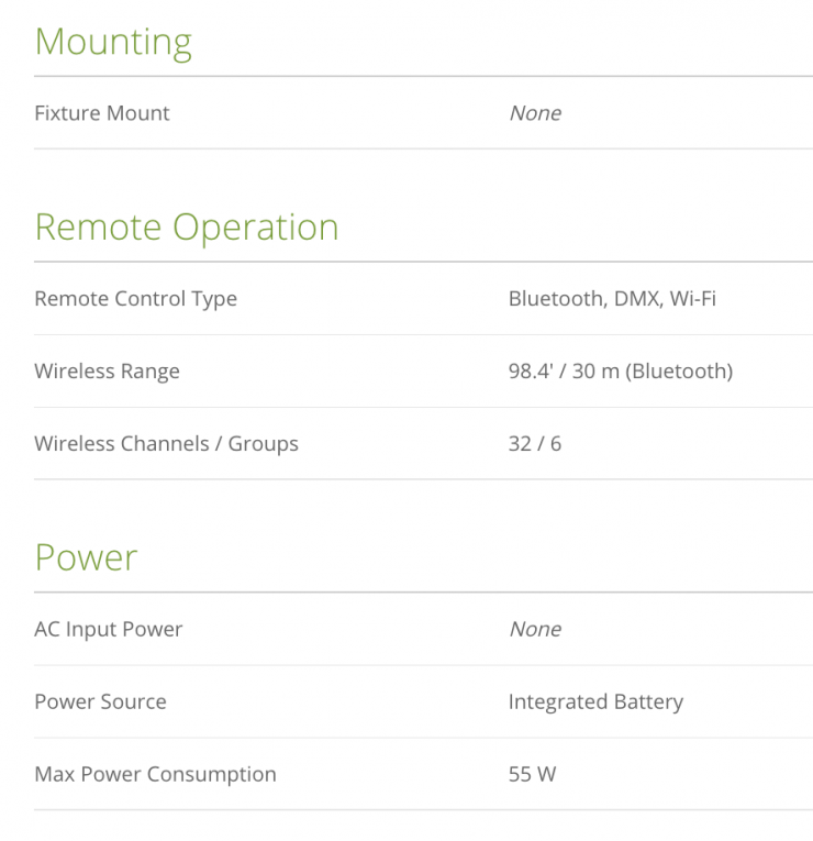 The light can be controlled from up to 98′ away. via a Bluetooth app. DMX control is also available, as well as 2.4 GHz radio control with an optional RC-R9 remote that has a wireless range of 197′ via 32 channels and 6 groups.
