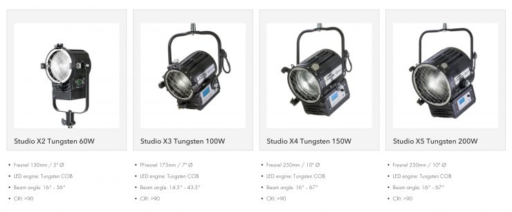 The most powerful of the lights is the Studio X7 Daylight (5,600K) 360W Fresnel that has a 14” lens with a spot-to-flood beam angle range of 12°-60°. The fixture offers a claimed output of 28,200 lux at 10ft/3m (spot).