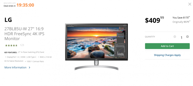 The LG 27BL85U-W 27″ 16:9 HDR FreeSync 4K IPS Monitor is on sale for $409.99 USD which is a saving of $170 USD.