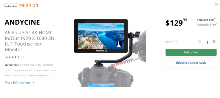 The ANDYCINE A6 Plus 5.5″ 4K HDMI In/Out 1920 X 1080 3D LUT Touchscreen Monitor is on sale for $129.99 USD, which is a saving of $50 USD.