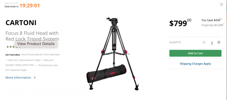 The Cartoni Focus 8 Fluid Head with Red Lock Tripod System is on sale for $799 USD, which is a saving of $436 USD.