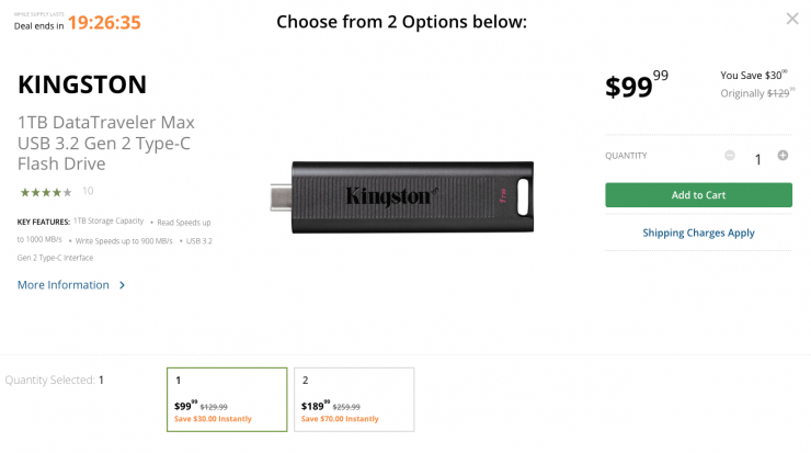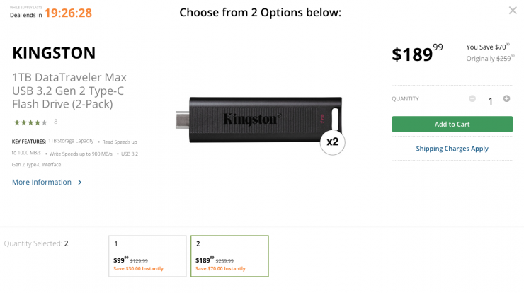 The Kingston 1TB DataTraveler Max USB 3.2 Gen 2 Type-C Flash Drive and Kingston 1TB DataTraveler Max USB 3.2 Gen 2 Type-C Flash Drive (2-Pack) are on sale for $99 USD and $189.99 USD respectively. These are savings of $30 USD and $70 USD.