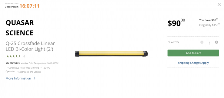 The Quasar Science Q-25 Crossfade Linear LED Bi-Color Light (2′) is on sale for $90 USD, which is a saving of $60 USD.
