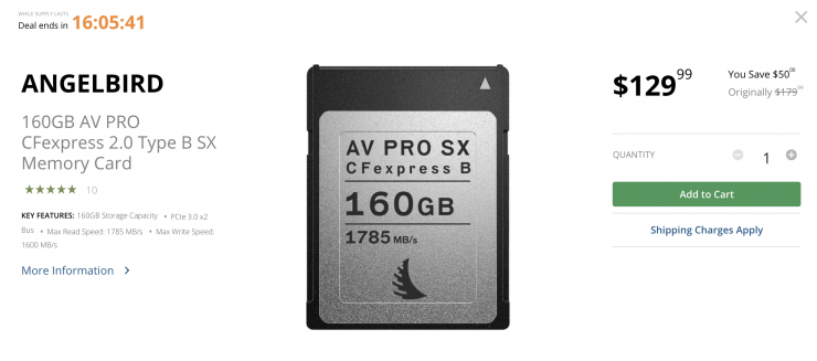 The Angelbird 160GB AV PRO CFexpress 2.0 Type B SX Memory Card is on sale for $129.99 USD which is a saving of $50 USD.