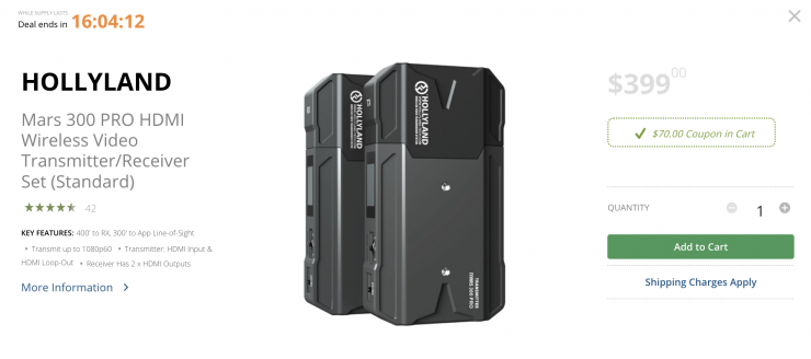The Hollyland Mars 300 PRO HDMI Wireless Video Transmitter/Receiver Set (Standard) is on sale for $329 USD which is a saving of $70 USD.
