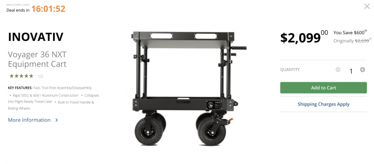 The Inovativ Voyager 36 NXT Equipment Cart is on sale for $2,099 USD which is a saving of $600 USD.