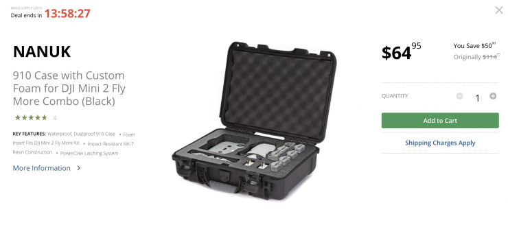 The Nanuk 910 Case with Custom Foam for DJI Mini 2 Fly More Combo (Black) is on sale for $64.95 USD which is a saving of $50 USD.