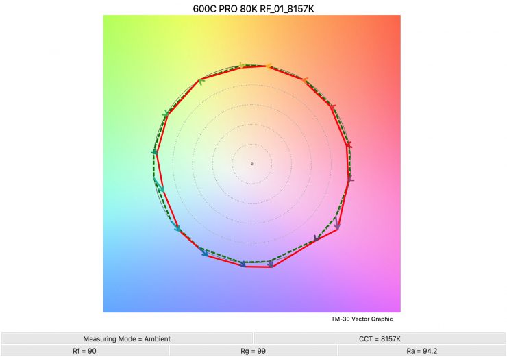 In the graph above the gold bars indicate a perfect CIE D55 source. The red bars indicate a perfect CIE D 5600K source. This lets us compare how close to a perfect 5600K lighting source the LS 600c Pro is. A score in the low 70’s is typical for a 5600K LED source.