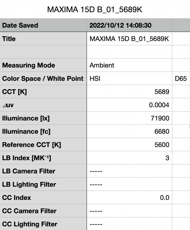 The CC Index displays the CC correction value and whether any magenta or green need to be added or subtracted. 1 CC corresponds to 035 Kodak CC values or 1/8 Rosco filter values. Any reading less than +1.00 or -1.00 and you’re probably not going to need to make any kind of adjustment. The ⊿uv is the value to show how much this light is away from being an ideal light source (black body radiation = incandescent lamp). As with the CC Index you want this number to theoretically be zero. Kelvin is not a linear value, so we need to convert from Kelvin to MK-1 to compare the values of color temperature. To calculate from Kelvin to Mired is MK-1= 1*1000000/Kelvin. While this may sound confusing, it is the only way of measuring if the Kelvin shift is significant enough to warrant having to use a filter for correction. Below are the results for the Maxima 3 when using the Regular Mode.